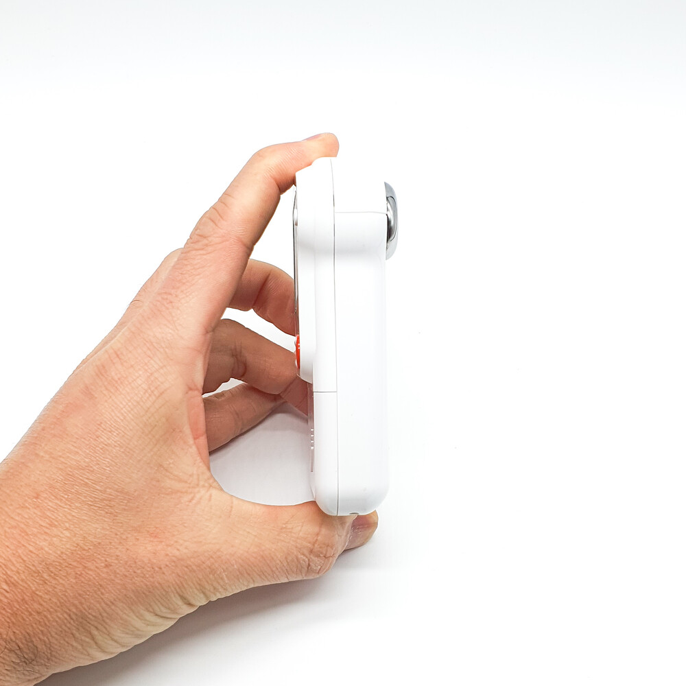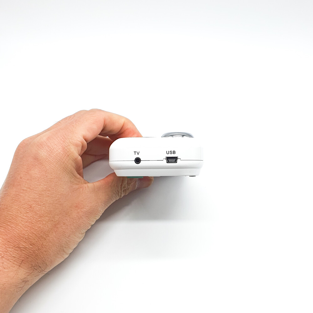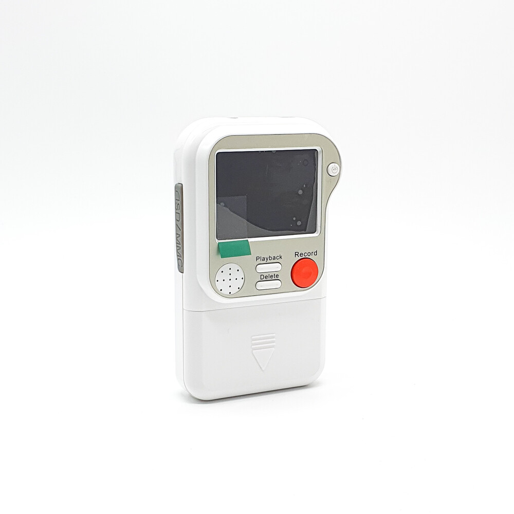 흰색 바디에 빨간 버튼이 돋보이는 레트로한 디자인의 캠코더입니다.⠀