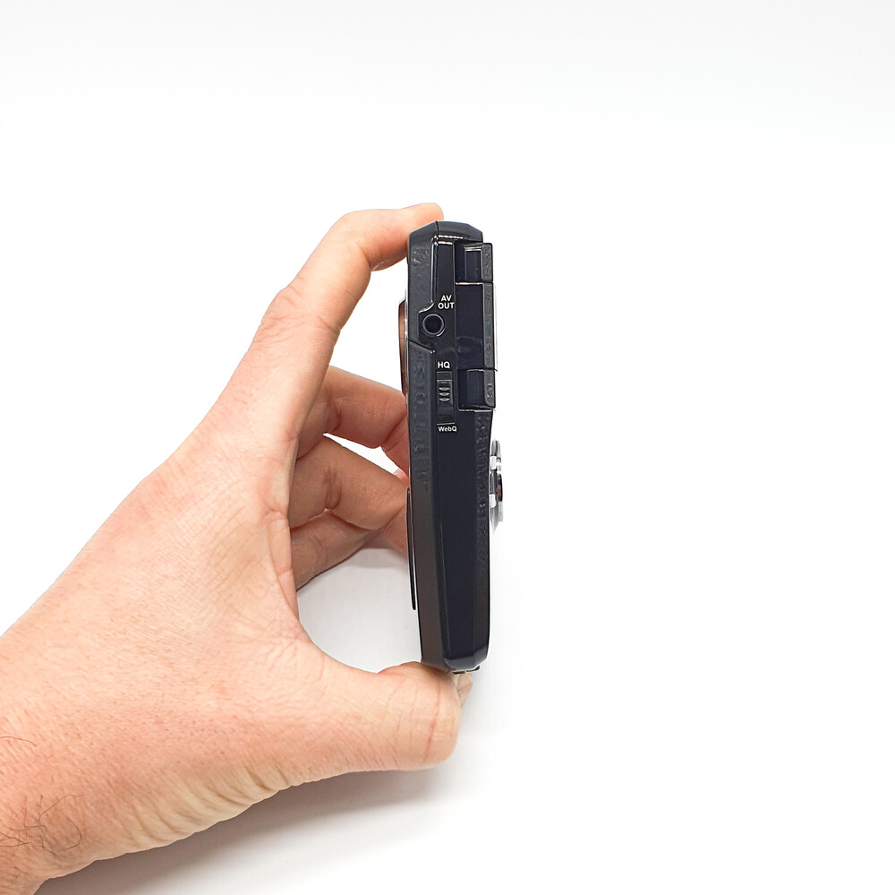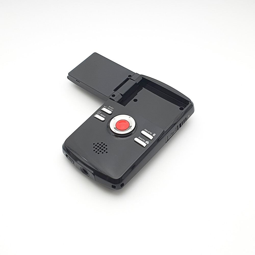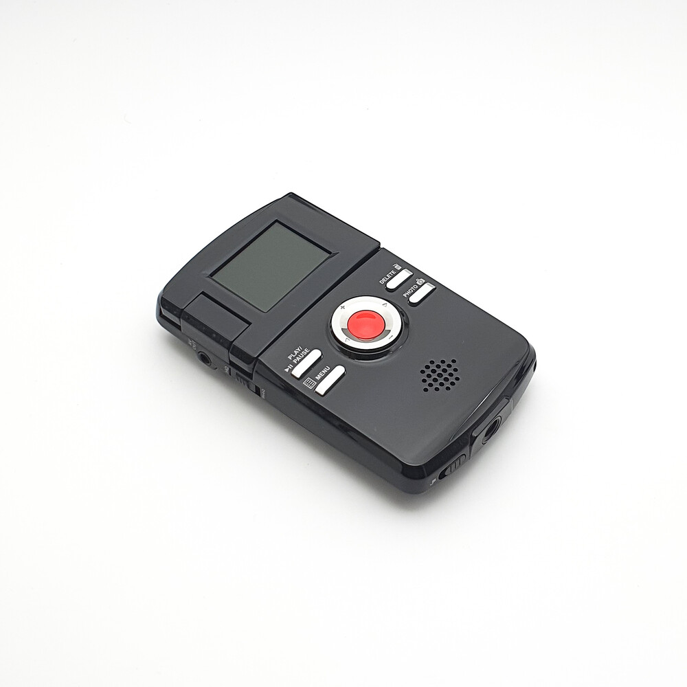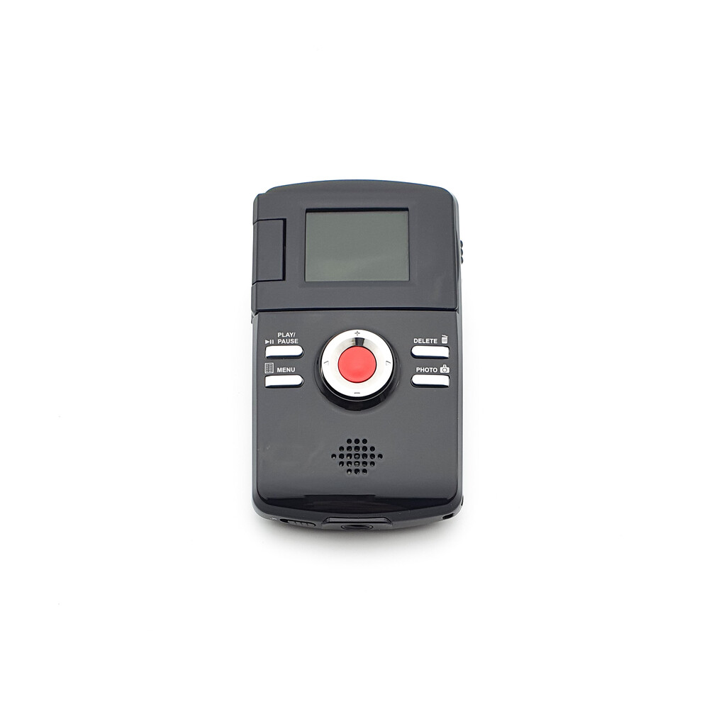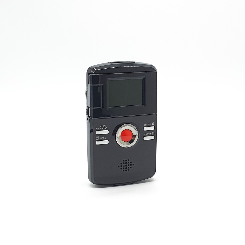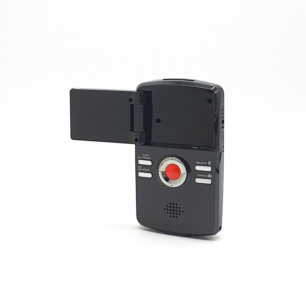 검정색 바디에 빨간 버튼이 돋보이는 레트로한 디자인의 캠코더입니다.