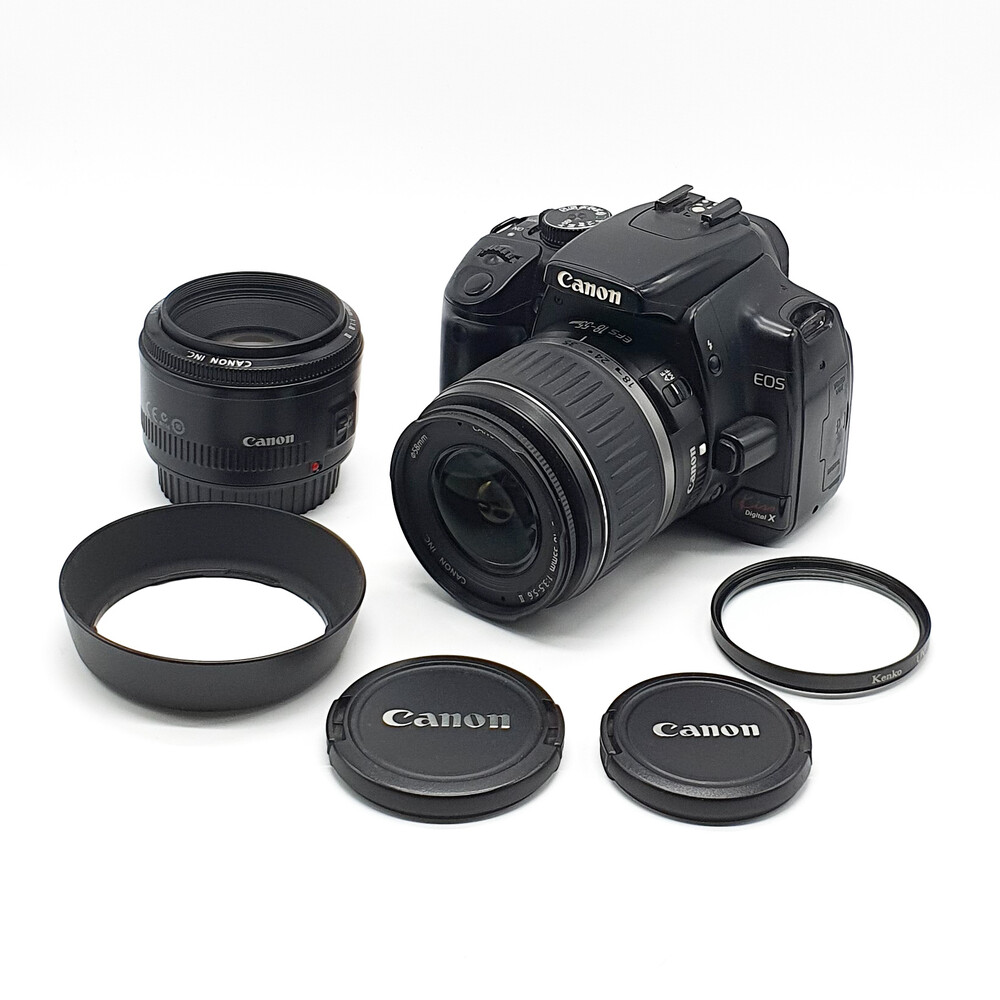 18-55mm 번들 렌즈(UV 필터 포함), 50mm 렌즈, 렌즈캡 2개, 후드, CF 카드 2GB, 카드 리더기, 전용 배터리 1개, 배터리 충전기 포함 구성입니다.