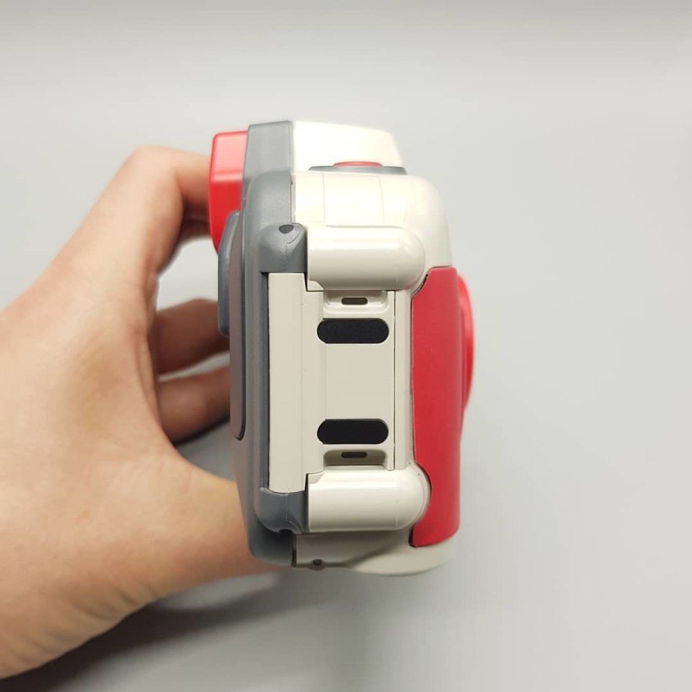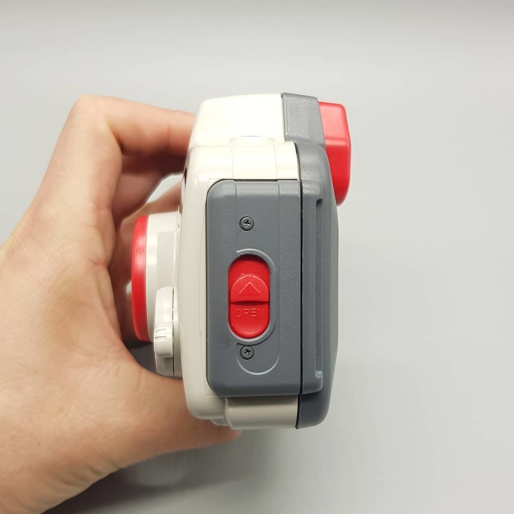 32mm 화각에f/3.5의 밝고 성능 준수한 렌즈가 장착되어있고 전면부 다이얼로 온/오프 및 플레시 제어, 자동모드, 근접촬영 모드(꽃 아이콘) 등을 설정 할 수 있습니다. 셀프타이머 버튼은 상단부에 있습니다.