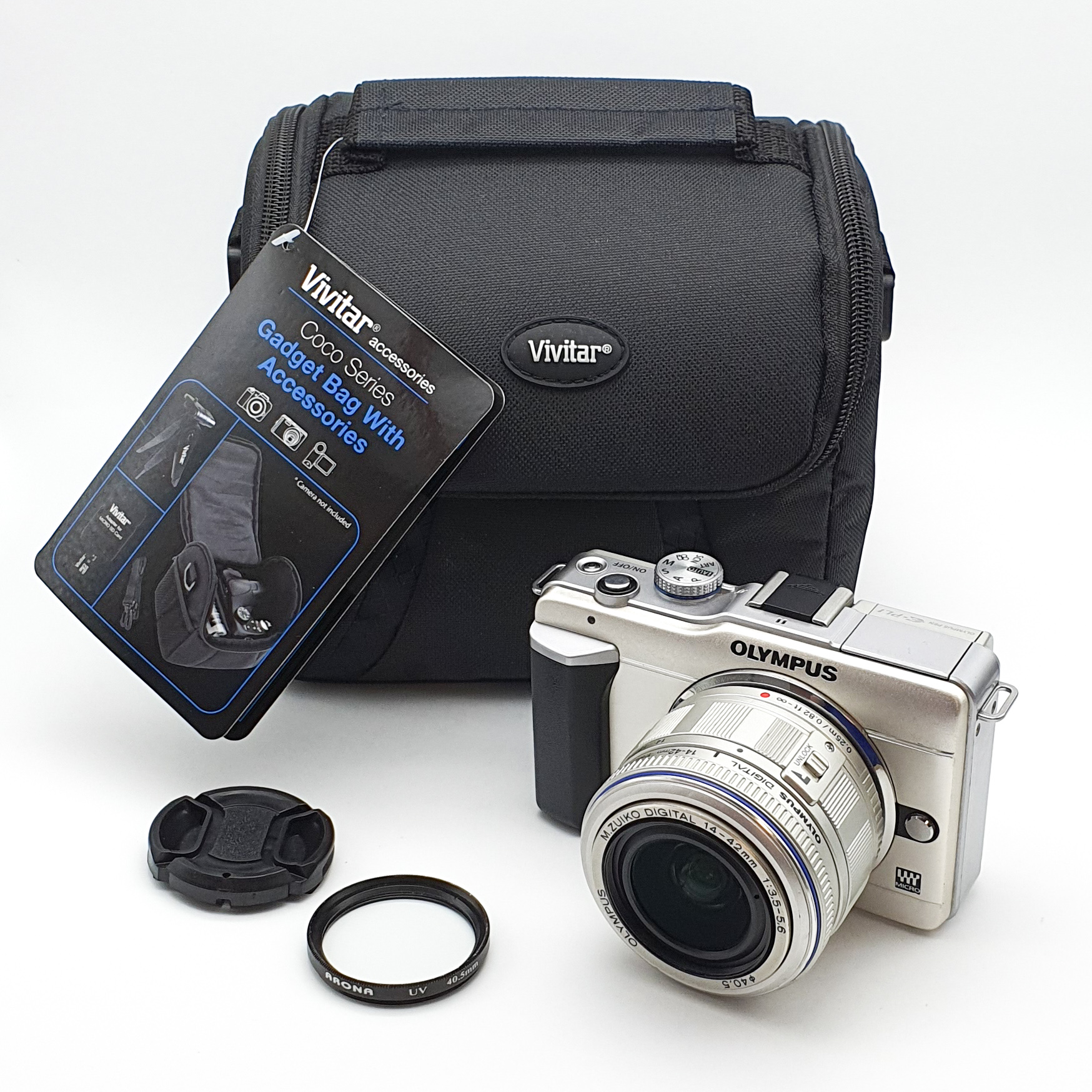 본체 및 스트랩, 14-42mm 번들 렌즈, 렌즈캡, 렌즈 필터, 16GB 메모리 1개, 카드 리더기, 전용 배터리 1개, 충전기, 비비타 카메라 가방(새제품) 포함 구성입니다.