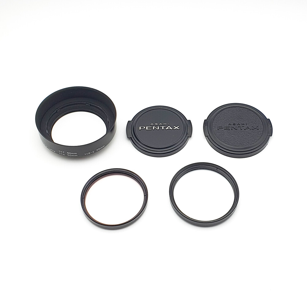 50mm 1.4 렌즈(후드 포함), 105mm 2.8 렌즈, 렌즈 캡, 그리고 사진에는 없지만 스트랩 포함 구성입니다.