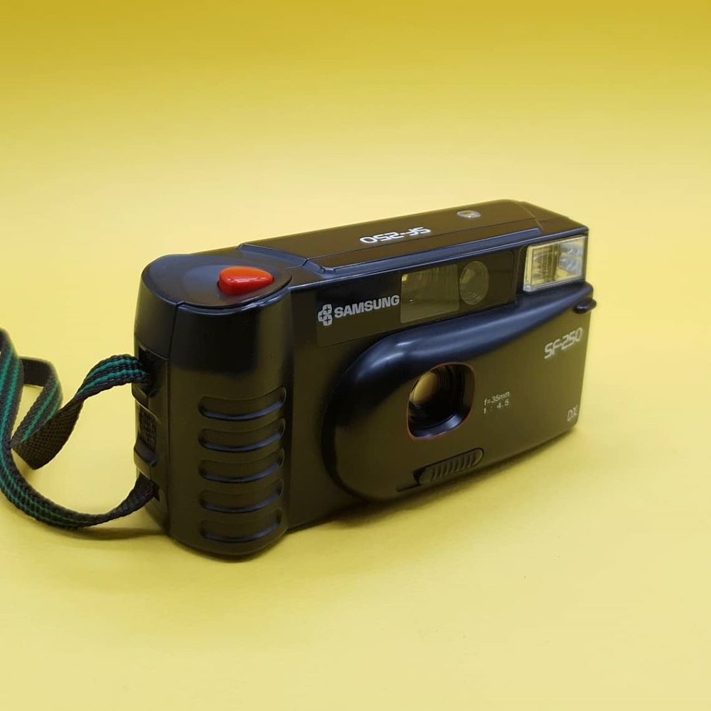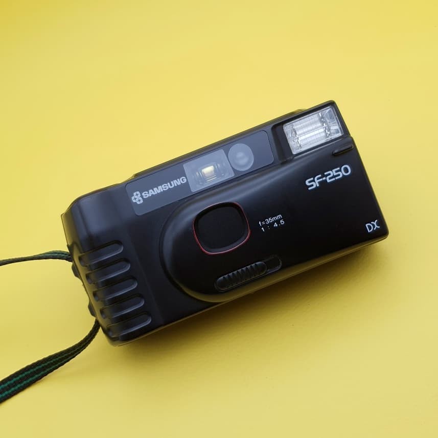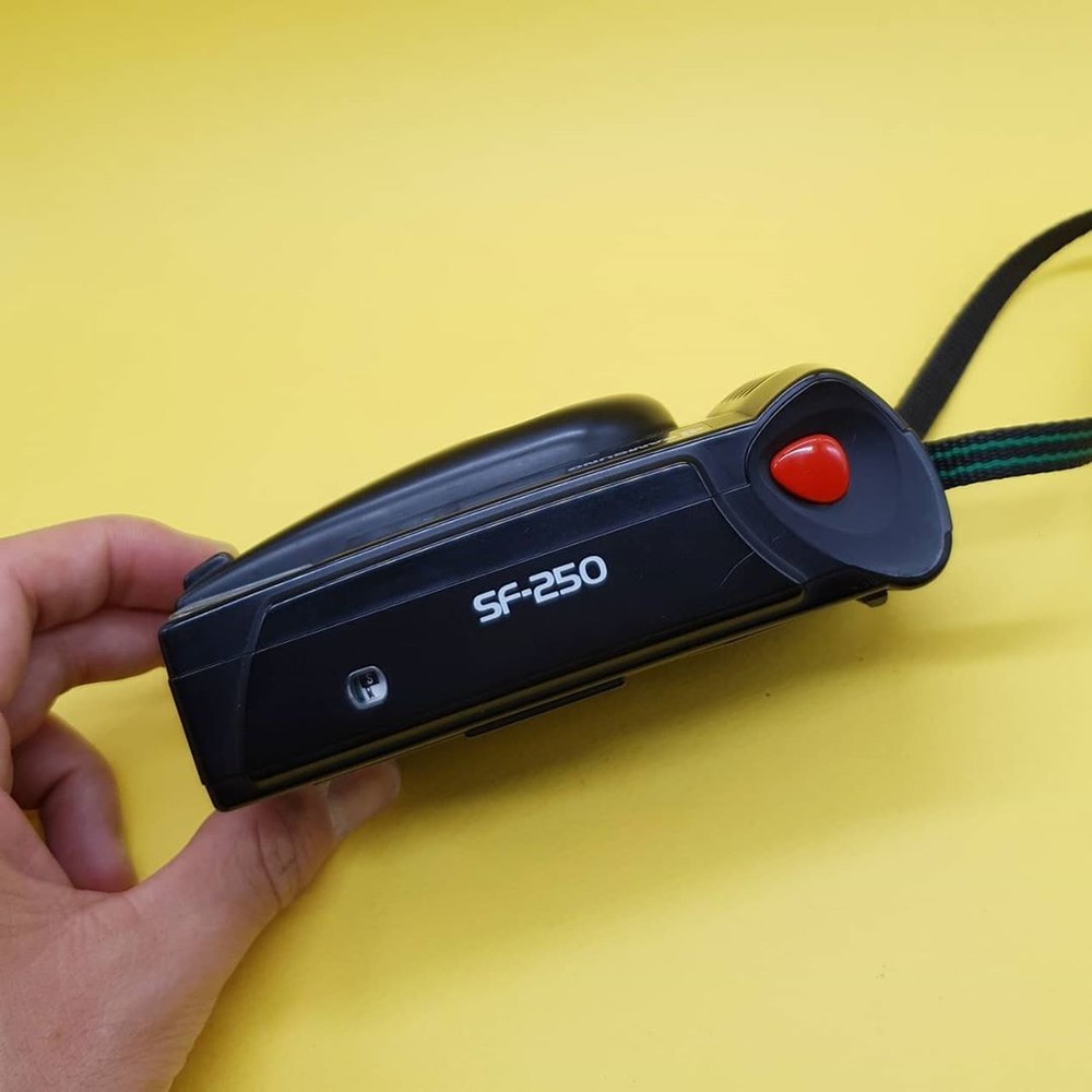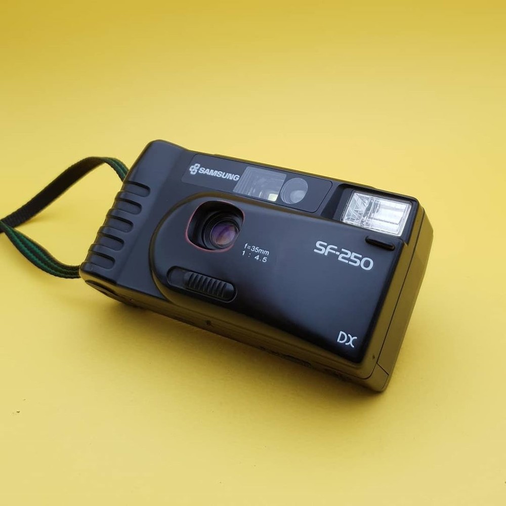 1988년 출시된 고정포커스 카메라 SAMSUNG SF-250입니다. 삼성 카메라 중 초기형 모델로 국내에서 제조하긴 했지만 미놀타 FS-E를 기반으로 전면부 디자인만 바꿔서 출시한 카메라입니다.