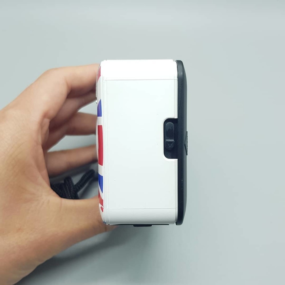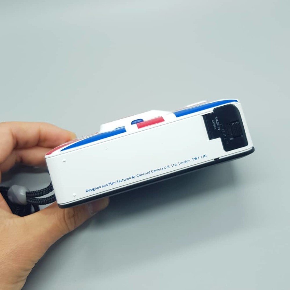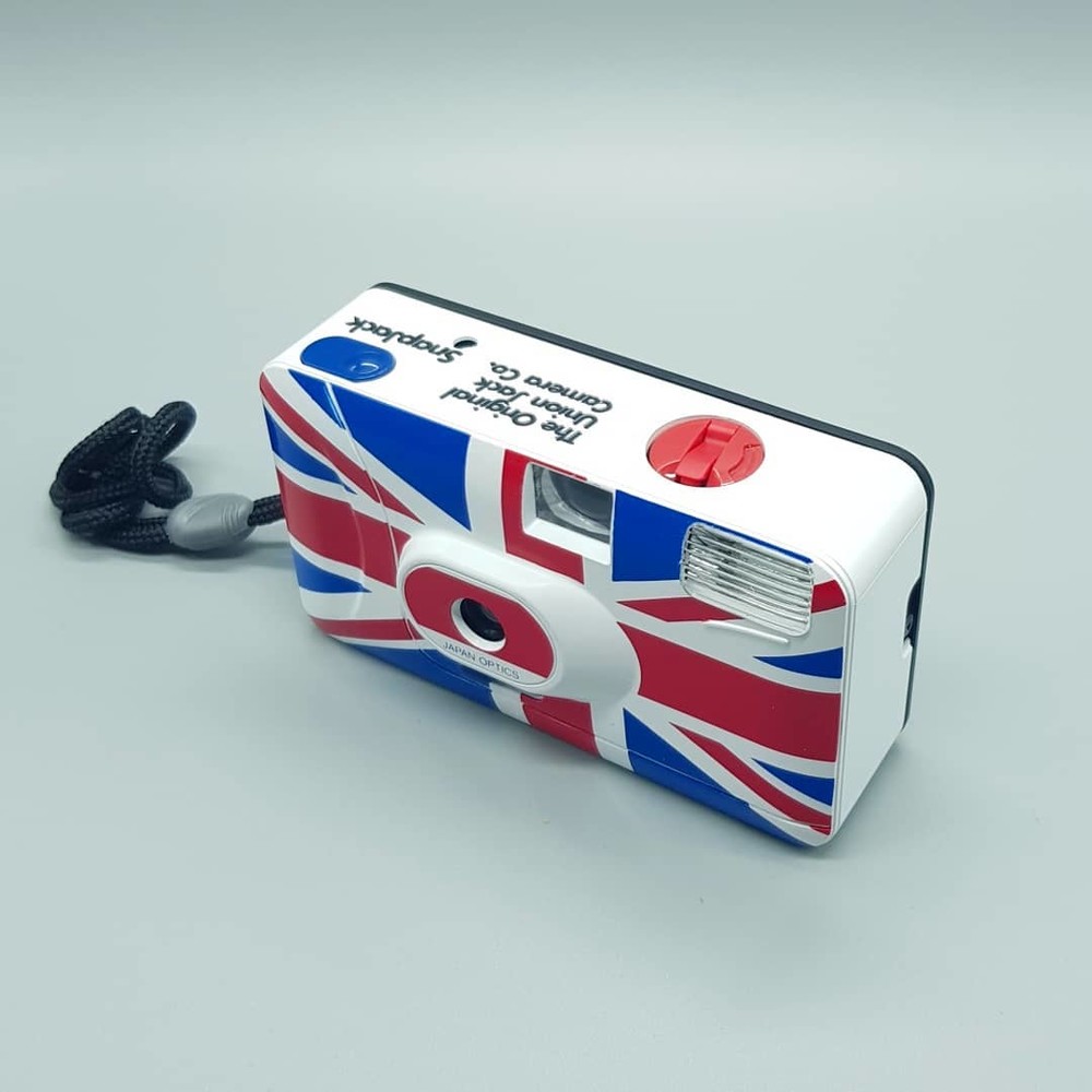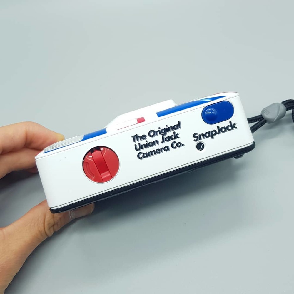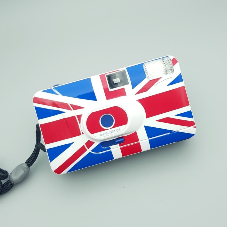 영국 국기인 유니언잭의 흰색, 빨간색, 파란색이 예쁘게 어우러진 디자인에 사용법 간단한 고정 포커스 카메라입니다.